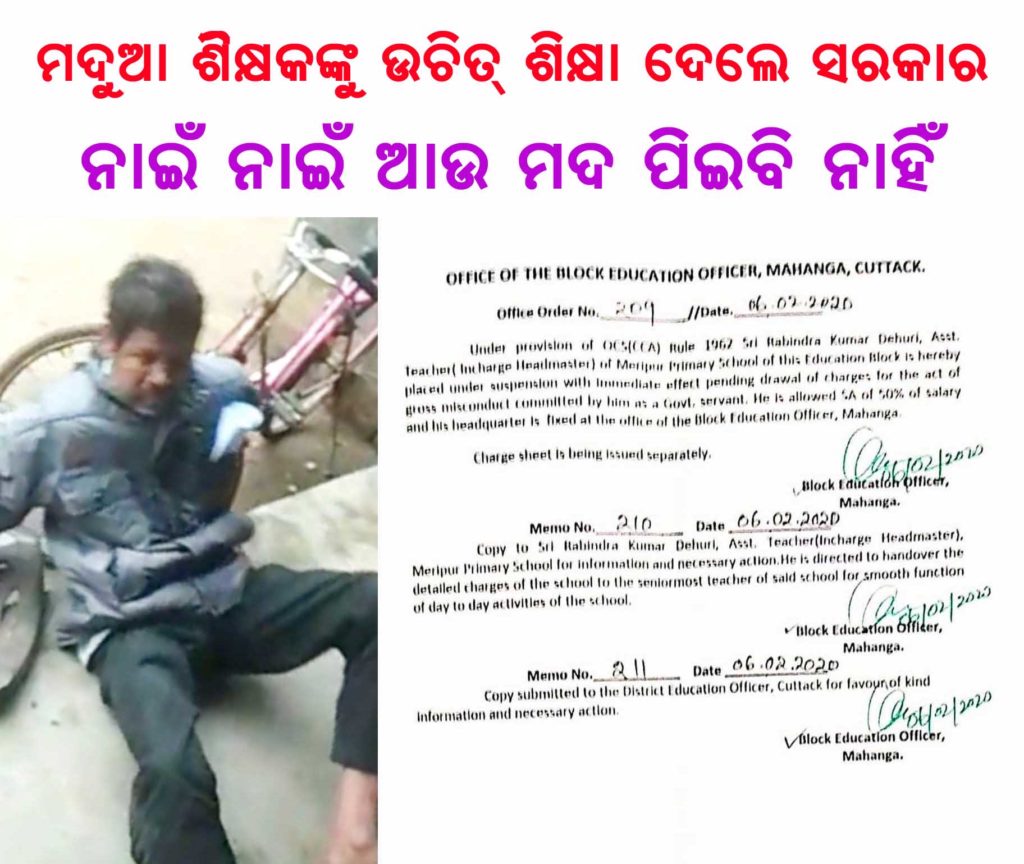 କଟକ ଜିଲ୍ଲା (ଓଡିଶା ତାଜା ନିଉଜ) ମାହଙ୍ଗା 09/02/20 :- କଟକ ଜିଲ୍ଲା ମାହଙ୍ଗା ବ୍ଲକ ଅଂଚଳରେ ଜଣେ ମଦ୍ୟପ ପ୍ରଧାନଶିକ୍ଷକଙ୍କ ଭିଡିଓ ଭାଇରାଲ ହେବା ଘଟଣା ଗଣମାଧ୍ୟମରେ ପ୍ରକାଶ ପାଇବାପରେ ବାଧ୍ୟହୋଇ ସମ୍ପୃକ୍ତ ପ୍ରଧାନ ଶିକ୍ଷକ ରବୀନ୍ଦ୍ର ଦେଉରିଙ୍କୁ ଶିକ୍ଷା ବିଭାଗ ନିଲମ୍ବନ କରିଚି, ବାରମ୍ବାର ଗଣମାଧ୍ୟମରେ ଖବର ପ୍ରକାଶ ପାଇବାରୁ ମାହାଙ୍ଗା ବ୍ଲକ ଶିକ୍ଷାଅଧିକାରୀ ଏହାର ବିଧିବଦ୍ଧ ତଦନ୍ତ କରିବା ସହ ସମ୍ପୃକ୍ତ ମାତାଲ ଶିକ୍ଷକ ଙ୍କ ବିରୋଧରେ କାର୍ଯ୍ୟାନୁଷ୍ଠାନ ନେବାକୁ ଜିଲ୍ଲା ଶିକ୍ଷାଧିକାରୀଙ୍କୁ ଜଣାଇବା ସହ ତାଙ୍କୁ ତୁରନ୍ତ ତାଙ୍କ ପଦରୁ ନିଲମ୍ବନ କରିବା ସହ ହେଡକ୍ୱାଟର ରେ ରହିବାକୁ ନିର୍ଦେଶ ଦିଆଯାଇଛି, ପ୍ରକାଶ ଯେ କଟକ ଜିଲ୍ଲା ମାହାଙ୍ଗା ବ୍ଲକ ମେରିପୁର ପ୍ରାଥମିକ ବିଦ୍ୟାଳୟର, ପ ମାତାଲ ପ୍ରଧାନଶିକ୍ଷକ ଗତ 5 ତାରିଖ ଦିନ ମଦ ପିଇ ମାତାଲ ହୋଇ ସ୍କୁଲ ଆସିଥିବା ବେଳେ ଗ୍ରାମବାସୀ ମାନେ ଦେଖି ଏହାକୁ ବିରୋଧ କରିବାସହ ଏହି ଘଟଣାର ଭିଡ଼ିଓ ସାମାଜିକ ଗଣମାଧ୍ୟମରେ ଭାଇରାଲ କରିଥିଲେ, ଏ ଶିକ୍ଷକ ଜଣକ ହେଉଛନ୍ତି ଏ ସ୍କୁଲର ଭାରପ୍ରାପ୍ତ ପ୍ରଧାନ ଶିକ୍ଷକ, ତାଙ୍କ ନାମ ହେଉଛି ରବିନ୍ଦ୍ର ଦେଉରି। ହେଲେ ଗାଁ ଲୋକେ ସାର ଙ୍କୁ ବୁଝାଇ ଆଗରୁ ବହୁ ଥର ଛାଡ଼ି ଦେଇଥିଲେ। ହେଲେ ପୁଣି ଥରେ ସାର ମଦ ପିଇ ସ୍କୁଲ କୁ ଆସିବାରୁ ଗ୍ରାମବାସୀମାନେ ଭିଡ଼ିଓ ଭାଇ ରାଲ କରିଥିଲେ, ଏହାକୁ ଆଧାରକରି ବ୍ଲକ ଶିକ୍ଷାଅଧିକାରୀ ଚକ୍ରଧର ବେହେରା ସମ୍ପୃକ୍ତ ଭାରପ୍ରାପ୍ତ ପ୍ରଧାନ ଶିକ୍ଷକଙ୍କୁ କାର୍ଯ୍ୟରୁ ନିଲମ୍ବନ କରିଚନ୍ତି, ମାହାଙ୍ଗାରୁ ଲଷ୍ମୀଧର ଖୁଣ୍ଟିଆଙ୍କ ରିପୋର୍ଟ