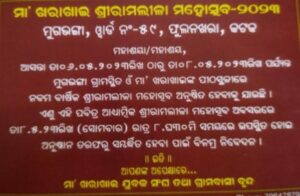 ୨୮ଏପ୍ରିଲ୍ ,୨୦୨୩ (ଓଡ଼ିଶା ତାଜାନ୍ୟୁଜ ) କଟକ ସଦର :- କଟକ ସଦର ଥାନା ଅନ୍ତର୍ଗତ ସିଏମସି ୫୯ ନମ୍ବର ୱ।ର୍ଡ଼ ଫୁଲନଖରା ନିକଟସ୍ଥ ମୁଗଭଙ୍ଗା ଗ୍ରାମର ମା, ଖରାଖାଈଙ୍କ ପୀଠ ସ୍ଥଳୀରେ ଆସନ୍ତା ମେ ମାସ ୬ ତାରିଖ ଠାରୁ ୮ତାରିଖ ପର୍ଯ୍ୟନ୍ତ ବିଶ୍ୱ ଶାନ୍ତି ମହାଯଜ୍ଞ ସହିତ, ପ୍ରତ୍ୟେକ ସନ୍ଧ୍ୟାରେ ବିଭିନ୍ନ ସାଂସ୍କୃତିକ ଅନୁଷ୍ଠାନ ପକ୍ଷରୁ ନୃତ୍ୟ ପରିବେଷଣ, ରାତି ୧୧ଟାରେ ରାମଲୀଳା ପରିବେଷଣ କରାଯିବ । ରାତି ୧୦ ଟାରେ ମା, ଖରାଖାଈ ରାମଲୀଳା ସମିତି ଅନୁଷ୍ଠାନ ପକ୍ଷରୁ କଳାକାର , ପ୍ରଶାସନିକ ଅଧିକାରୀ, ରାଜନୈତିକ ବ୍ୟକ୍ତି , ସାମ୍ବାଦିକ, ସମାଜସେବୀ ,