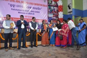 ୨୦ ଡିସେମ୍ବର ୨୦୨୪ (ଓଡ଼ିଶା ତାଜା ନ୍ୟୁଜ୍ ) ଭଦ୍ରକ :-> ଭଦ୍ରକ ଜିଲ୍ଲା ସ୍ୱାସ୍ଥ୍ୟସେବାରେ ଗୋଷ୍ଠୀ ସହଭାଗିତା ଆଧାରରେ ଉଲ୍ଲେଖନୀୟ ଉଳେ କାର୍ଯ୍ୟ ଓ ନାୟିତ୍ଵ ନିର୍ବାହ ପାଇଁ ଯୋଗ୍ୟ ଆଶାକର୍ମୀ, ଗ୍ରାମ କଲ୍ୟାଣ ସମିତି ଓ ମହିଳା ଆରୋଗ୍ୟ ସମିତିମାନଙ୍କୁ ନଙ୍କୁ ପୁରସ୍କୃତ କରାଯିବା ନେଇ ଭଦ୍ରକ ଜିଲ୍ଲା ଆଶା, ଗ୍ରାମକଲ୍ୟାଣ ସମିତି ସମାବେଶ ଅନୁଷ୍ଠିତ ହୋଇଯାଇଛି ।ସହିଦ୍ ସ୍ମୃତି ଭବନରେ ଜିଲ୍ଲା ମୁଖ୍ୟ ଚିକିତ୍ସାଧକାରୀ ଡ଼ା. ସୁଧାଂଶୁ ଶେଖର ବଳଙ୍କ ଅଧ୍ୟକ୍ଷତାରେ ଅନୁଷ୍ଠିତ ଏହି ସମାବେଶରେ ଭଦ୍ରକ ଜିଲ୍ଲାପରିଷଦର ଅଧ୍ୟକ୍ଷ ପ୍ରଫୁଲ୍ଲ କୁମାର ଜେନା ମୁଖ୍ୟ । ଅତିଥି ଭାବେଯୋଗ ଦେଇ କାର୍ଯ୍ୟକ୍ରମ ଉଦ୍ଘାଟନ କରିଥିଲେ ।