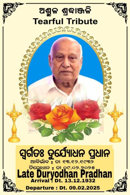 He was popularly known as Dhani Pradhan in village because of his illustrious charity services. He got married to Late Nilima Pradhan in the year 1955. Shri Pradhan’s last rites were performed at the Swarga Dwara of Puri by the family members on early morning of Monday. His eldest Son Rabindranath Pradhan offered fire to the funeral pyre.