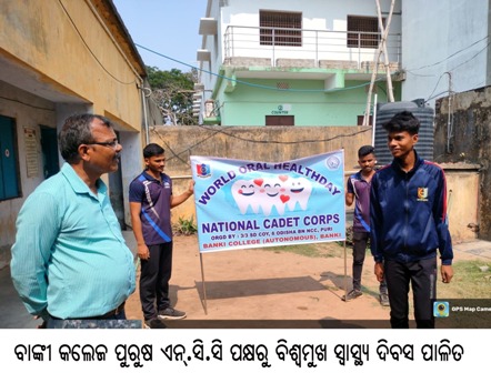 ବାଙ୍କୀ  (ଓଡ଼ିଶା ତାଜା ନ୍ୟୁଜ୍) :- ବାଙ୍କୀ ସ୍ୱୟଂଶାସିତ ମହାବିଦ୍ୟାଳୟ ପୁରୁଷ ଏନ୍‌.ସି.ସି ଆନୁକୁଲ୍ୟରେ ବିଶ୍ୱ ମୁଖ ସ୍ୱାସ୍ଥ୍ୟ ଦିବସ ପାଳିତ ହୋଇଯାଇଛି । ପୁରୁଷ ଏନ୍‌.ସି.ସି ଅଧିକାରୀ କ୍ୟାପଟେନ୍ ଗୁରୁବାରୀ ସାହୁଙ୍କ ତତ୍ତ୍ୱାବଧାନରେ ଏହି କାର୍ଯ୍ୟକ୍ରମ ଆୟୋଜିତ ହୋଇଯାଇଛି ।