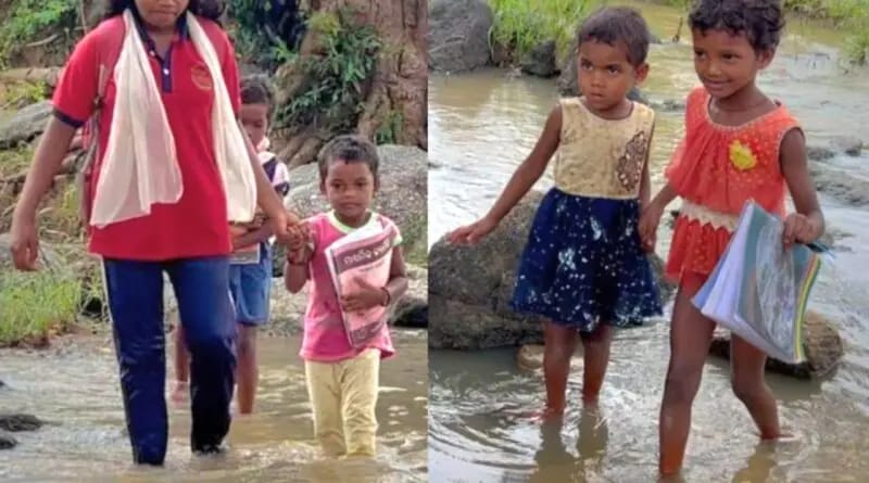 ଆର,ଉଦୟଗିରି (ଓଡ଼ିଶା ତାଜା ନ୍ୟୁଜ୍) :- ଗଜପତି ଜିଲ୍ଲାର ଅନେକ ବନ ପାହାଡ଼ ଘେରା ଦୁର୍ଗମ ଅଞ୍ଚଳରେ ପାହାଡିଆ ନାଳ ଓ ନଦୀ ବିପଦପୂର୍ଣ୍ଣ ଭାବେ ଅତିକ୍ରମ କରି କୋମଳମତି ଶିଶୁମାନେ ପ୍ରାଥମିକ ବିଦ୍ୟାଳୟକୁ ଆସୁଥିବା ଲକ୍ଷ୍ୟ କରାଯାଇଛି. ଖରା ଛୁଟି ଶେଷ ହେବା ପରେ ଗତ ଶୁକ୍ରବାର ଦିନ ଗଜପତି ଜିଲ୍ଲାରେ ସମସ୍ତ ସ୍କୁଲ ଖୋଲିଥିଲା. ସ୍କୁଲ ଖୋଲିବାର ପ୍ରଥମ ଦିନରେ ନଦୀ ପାର ହୋଇ ସ୍କୁଲକୁ ଯାଉଛନ୍ତି କୁନି କୁନି ଛାତ୍ରୀଛାତ୍ର. ଏଭଳି ଦୃଶ୍ୟ ଦେଖିବାକୁ ମିଳିଛି ଗଜପତି ଜିଲ୍ଲା ମୋହନା ବ୍ଲକର ଡେଙ୍ଗାଆମ୍ବ ଗାଁ ନିକଟରେ ଥିବା ନଦୀରେ କୋମଳ ମତି ଶିଶୁ ମାନେ ବିପଦ ପୂର୍ଣ୍ଣ ଭାବେ ନଦୀ ପାର ହୋଇ ସ୍କୁଲକୁ ଯାଉଥିବା ଦୃଶ୍ୟ l