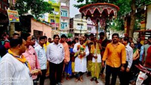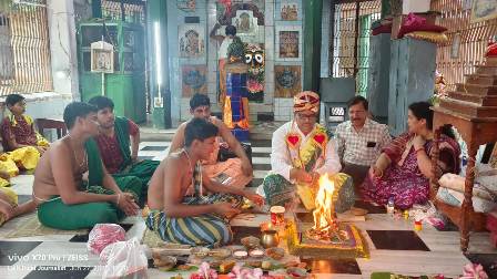 ମନ୍ଦିରର ପାଟ ପୁରୋହିତ ପଣ୍ଡିତ ଗତିକୃଷ୍ଣ ମିଶ୍ର ଶର୍ମା ଓ ସହାୟକ ରଞ୍ଜିତ ଦାଶ ଶର୍ମା ରଥ ପ୍ରତିଷ୍ଠା କରିବା ପରେ ବୈଦିକ ରୀତିରେ ମଙ୍ଗଳାର୍ପଣ କରିଥିଲେ ।ମଧ୍ୟାହ୍ନ ପ୍ରାୟ ସାଢେ଼ ୧୨ ଟାରେ ଠାକୁର ମାନଙ୍କୁ ବାଦ୍ୟ ବାଜଣା, ହରିବୋଲ, ହୁଳହୁଳି ଧ୍ୱନି ସହ ଛତି ତରାସ, ବାନା ବୈରଖ, ନୃତ୍ୟାଦି ପଟୁଆରରେ ଦିଅଁ ମାନଙ୍କୁ ଗୋଟି ପହଣ୍ଡିରେ ବିଜେ କରାଯାଇଥିଲା । ପ୍ରଥମେ ଶ୍ରୀ ସୁଦର୍ଶନ ଓ ପରେ ବଳଭଦ୍ର, ଦେବୀ ସୁଭଦ୍ରା ଓ ଶେଷରେ ଶ୍ରୀ ଜଗନ୍ନାଥଙ୍କୁ ପହଣ୍ଡି ବିଜେ କରାଯାଇଥିଲା ।