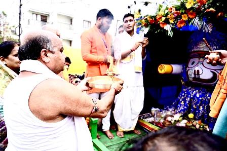 Raipur (Odisha Tazanews) :- The Annual Car Festival was celebrated by the largest Jagannath Temple of Chhattisgarh at Gayatri Nagar in Raipur with pomp, splendour and massive fanfare. The Mega Ceremony hosted by Shree Jagannath temple Seva Samiti witnessed the congregation of more than a lakh Odia and Non Odia Devotees from Raipur and adjoining areas. In the morning religious rituals were performed before the Deities in the Temple amidst spiritual fervour. Special Havan was organised here to invoke the blessings of the God.