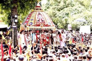 At around 1.15 p.m. in the afternoon the Four Deities were taken in Dhadi Pahandi procession to the colourfully decked up chariot stationed at the Grand Road in front of the temple. The entire atmosphere got reverberated with the recitals of hymns, roaring of slogans like Haribol and Jai Jagannath, sounding of Huluhuli, blowing of conch and playing of musical instruments such as Ghanta, Kartala, Mardala, Jhanja and Mrudanga by the devotees.