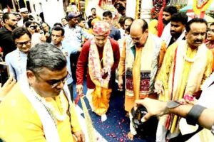 At about 4.00 p.m. the Four Deities were taken in Dhadi Pahandi procession from the Gundicha Temple to the aesthetically and elegantly decorated chariot stationed at the Grand Road in front of the temple.The whole ambience got reverberated with the recitals of hymns, shouting of slogans like Hari Bol, Jai Jagannath and playing of musical instruments like Ghanta, Mardala, Jhanja and Mrudanga by the devotees and servitors.The incessant rain in the afternoon here was seeming like showering of Lord of the Universe’s blessings from sky.