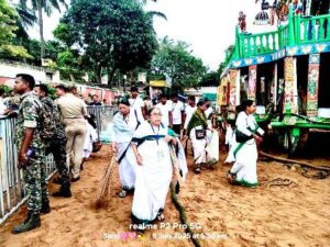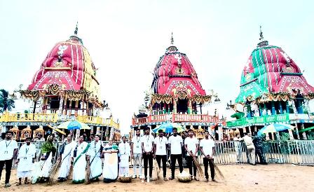 The Volunteers of the IIPM under the supervision of Director and Secretary Dr Arundhati Debi undertook a special cleanliness drive around the three Chariots, Grand Road and Saradhabali on the day of Bahuda Yatra. The Health Camp was inaugurated by Renowned Heart Specialist Dr Amulya Kumar Bisi and Senior Physician Dr Gayatri Mohanty.