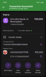 ମୋଟ୍ ଉପରେ ୫୦ ହଜାର ଟଙ୍କା ଲାଞ୍ଚ ନେବା ପରେ ବିଲ କରିଥିଲେ । ଏପରିକି ନିଜର ଝିଅ ବାହାଘର କରିବା ପାଇଁ ଆଉ କିଛି ଟଙ୍କା ମାଗିଥିଲେ, ଓ କହିଥିଲେ ବହୁତ ଅସୁବିଧା ରେ ଅଛି ମୋତେ ମୋ ଝିଅ ବାହାଘର କରିବା ପାଇଁ ଆଉ କିଛି ଟଙ୍କା ଦିଅ ଝିଅ ବାହାଘର କଥା କହି ପରବର୍ତ୍ତୀ ସମୟରେ ନଗଦ ଆକାରରେ ୧ଲକ୍ଷ ୪୦ ହଜାର ଟଙ୍କା ନେଇଥିଲେ। କାଉସିଲର, ସେକ୍ ଜମିରୁଲ୍କା, ଙ୍କ ପାଖରୁ ନେଇ ଥିଲେ ଓ କହିଥିଲେ ମୁଁ, ସମସ୍ତ ଟଙ୍କା ଅଗଷ୍ଟ ୫ ତାରିଖ ସୁଦ୍ଧା ଟଙ୍କା ଫେରାଇ ଦେବାକୁ ପ୍ରତିଶ୍ରୁତି ଦେଇଥିଲେ।