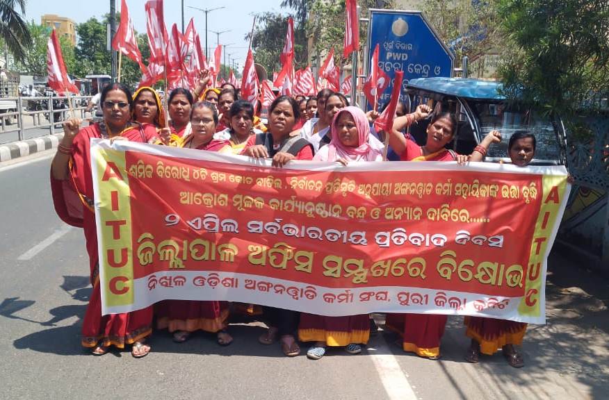 ପୁରୀ (ଓଡ଼ିଶା ତାଜା ନ୍ୟୂଜ୍) (ନିପ୍ର ) :- ସର୍ବଭାରତୀୟ ଶ୍ରମିକ ସଂଗଠନ ଏଆଇଟିୟୁସି (AITUC) ସହଯୋଗୀ ନିଖିଳ ଓଡ଼ିଶା ଅଙ୍ଗନୱାଡି କର୍ମୀ ସଂଘର ପକ୍ଷରୁ ୧୨ ଦଫା ଦାବି ନେଇ ଏପ୍ରିଲ ୨ ତାରିଖରେ ପୁରୀ ଜିଲ୍ଲାପାଳଙ୍କ କାର୍ଯ୍ୟାଳୟ ଘେରାଉ କରାଯାଇଥିଲା । ଶ୍ରମିକ ବିରୋଧୀ କେନ୍ଦ୍ର ସରକାରଙ୍କ ୪ଟି ଶ୍ରମ କୋଡ୍କୁ ବାତିଲ କରିବା, ଅଙ୍ଗନୱାଡି କର୍ମୀ ଓ ସହାୟିକାଙ୍କୁ ମାସିକ ସର୍ବନିମ୍ନ ୨୬ ହଜାର ଟଙ୍କା ଭତା ପ୍ରଦାନ, ଅବସରକାଳୀନ ସହାୟତା ତୁରନ୍ତ ଦେବା, ସ୍ୱାସ୍ଥ୍ୟ ସମ୍ବନ୍ଧୀୟ ବୈଠକ ପାଇଁ ଭତା ପ୍ରଦାନ, ସତ୍ୟବାଦୀ ବ୍ଲକର ବାଘସାହି ଓ ଗୋପ ବ୍ଲକର ତାଳକପାର କର୍ମୀମାନଙ୍କ ଉପରେ ଆକ୍ରୋଶମୂଳକ କାର୍ଯ୍ୟାନୁଷ୍ଠାନ ବାତିଲ କରିବା ଇତ୍ୟାଦି ୧୨ ଦଫା ଦାବି ରହିଥିଲା ।