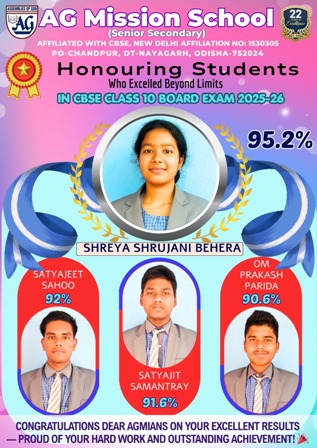 ଏହି ଫଳାଫଳ ସମସ୍ତ ବ୍ରାଂଚରେ ପ୍ରତିଭାଶାଳୀ ଛାତ୍ରଛାତ୍ରୀଙ୍କ ଉଲ୍ଲେଖନୀୟ ପ୍ରଦର୍ଶନକୁ ସୂଚିତ କରୁଛି ।ସ୍କୁଲର ଏହି ସଫଳତା ଏକ ସାମଗ୍ରିକ ଶିକ୍ଷାଗତ ଦର୍ଶନ ସହ ଜଡିତ । ଏହି ଶିକ୍ଷାନୁଷ୍ଠାନ ଦକ୍ଷ ଶିକ୍ଷକ ଶିକ୍ଷୟତ୍ରୀ, ପ୍ରଗତିଶୀଳ ମାର୍ଗଦର୍ଶନ ଓ ଅଭିଭାବକଙ୍କ ସହ ମଜବୁତ ସହଯୋଗିତା କାରଣରୁ ଏହି ସଫଳତା ହାସଲ କରିପାରିଛି । ଏ.ଜି. ମିଶନ୍ ବିଦ୍ୟାଳୟ ଦୃୃଢ,ଭବିଷ୍ୟତ-ପ୍ରସ୍ତୁତ ବ୍ୟକ୍ତିଙ୍କୁ ବିକଶିତ କରିବା ଜାରି ରଖିଛି, ଯାହା ପ୍ରମାଣ କରୁଛି ଯେ, ଦୃଢ ନିଷ୍ଠାର ଏକ ସଂସ୍କୃତି ଅସାଧାରଣ ସଫଳତା ପାଇଁ ପ୍ରେରଣାର ବାସ୍ତବ ଉତ୍ସ ଅଟେ ।