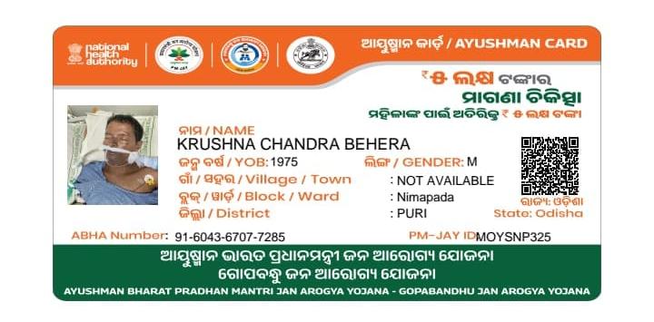 ଗୋପ (ଓଡ଼ିଶା ତାଜା ନ୍ୟୂଜ୍) (ନିପ୍ର ) :- ପୁରୀ ଜିଲ୍ଲା ନିମାପଡ଼ା ବାସିନ୍ଦା ଶ୍ରୀ କୃଷ୍ଣ ଚନ୍ଦ୍ର ବେହେରା (ବୟସ୍ ୫୧ ବର୍ଷ), ଯିଏ ଆର୍ଥିକ ଭାବେ ଦୁର୍ବଳ ପରିବାରର ହୋଇଥିବା ସତ୍ତ୍ୱେ ଆୟୁଷ୍ମାନ ଭାରତ ପ୍ରଧାନମନ୍ତ୍ରୀ ଜନ ଆରୋଗ୍ୟ ଯୋଜନା ପାଇଁ ଯୋଗ୍ୟ ଥିଲେ ମଧ୍ୟ ତାଙ୍କ ନାମ ତାଲିକାରେ ନଥିବାରୁ ସେ ଚିକିତ୍ସା ସୁବିଧାରୁ ବଞ୍ଚିତ ହୋଇଥିଲେ । ଏହାକୁ ଗୁରୁତ୍ୱ ଦେଇ ବିଜେପି କୃଷକ ମୋର୍ଚ୍ଚା ଓଡ଼ିଶାର ପୂର୍ବତନ ରାଜ୍ୟ ସଂପାଦକ ଶ୍ରୀ ପ୍ରଶାନ୍ତ ସ୍ୱାଇଁ ଗତ ୨୧ ତାରିଖରେ ସମ୍ପୃକ୍ତ କର୍ତ୍ତୃପକ୍ଷଙ୍କ ନିକଟକୁ ଏକ ଲେଖିତ ଆବେଦନ ପତ୍ର ପ୍ରେରଣ କରିଥିଲେ । ତାଙ୍କ ସକ୍ରିୟ ହସ୍ତକ୍ଷେପ ଓ ପ୍ରୟାସରେ ବର୍ତ୍ତମାନ ଶ୍ରୀ ବେହେରାଙ୍କୁ ଆୟୁଷ୍ମାନ କାର୍ଡ ଜାରି କରାଯାଇଛି ।