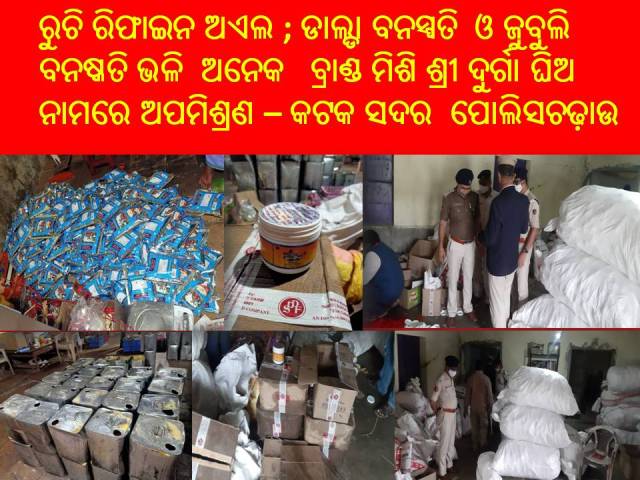 ମାଲଗୋଦାମ, ଜଗତପୁର, କଟକ ସଦର ଥାନା ଅଞ୍ଚଳରେ ଅପମିଶ୍ରଣ କାରବାର ଚାଲୁଥିଲା ବେଳେ ,ଏଥିପ୍ରତି ପୋଲିସ କାହିଁକି ନଜର ଦେଉନଥିଲା ବୋଲି ସାଧାରଣରେ ପ୍ରଶ୍ନବାଚୀ ସୃଷ୍ଟି କରିଛି । ମାଲ ଗୋଦାମ୍ ଅଞ୍ଚଳରେ ଶ୍ରୀ ଦୁର୍ଗା ନାମରେ ଅପମିଶ୍ରଣ ଘିଅ ବିକ୍ରି ହେଉଥିବା ପୋଲିସ ଖବର ପାଇ ଏହି ଚଢାଉ କରିଥିଲା । ବେଳେ ସଂପୃକ୍ତ ବ୍ୟକ୍ତି ଠାରୁ ଠିକଣା ପାଇ ମାଲ ଗୋଦାମ ପୋଲିସ ଚଢାଉ କରିଥିଲା । ଚଢାଉ ବେଳେ ନକଲି ଘିଅ ପ୍ରସ୍ତୁତି ର ପ୍ରମାଣ ପାଇଥିଲା ପୁଲିସ । ଏହି ଅପମିଶ୍ରଣ ଘିଅ ପ୍ରସ୍ତୁତିରେ ରୁଚି ରିଫାଇନ ଅଏଲ, ଡାଲ୍ଡା ବନସ୍ପତି, ଓ ଜୁବୁଲି ବନଷ୍କତି ଭଳି ଅନେକ ବ୍ରାଣ୍ଡ ମିଶି ଦୁର୍ଗା ଘିଅ ପ୍ରସ୍ତୁତି ହେଉଥିବା ଦେଖିବାକୁ ମିଳିଛି । ପୋଲିସର ଚଢ଼ାଉ ଅପମିଶ୍ରଣ କାରିଙ୍କୁ ଏଥିରୁ ନିବୃତ୍ତ ରହିବାକୁ ଦେଉଛି ନା କିଛି ଦିନ ପରେ ପୁଣି ଏହି କାରବାର ଚଲିବ, ସେପର୍ଯ୍ୟନ୍ତ ଲୋକେ ଅପେକ୍ଷା କରିଛନ୍ତି । (କଟକରୁ ଅମୂଲ୍ୟ କୁମାର ବାରିକଙ୍କ ରିପୋର୍ଟ )