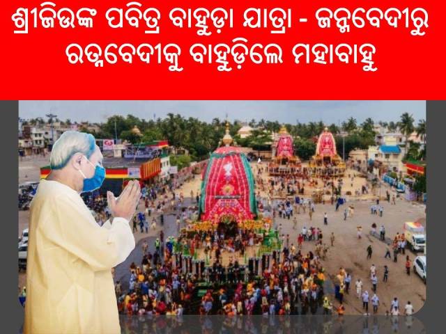ଓଡ଼ିଶା ତାଜାନ୍ୟୁଜ (୨୦ ଜୁଲାଇ ମଙ୍ଗଳବାର ) ଭୁବନେଶ୍ୱର :- କୋ‍ଭିଡ କଟକଣା ମଧ୍ୟରେ ସମସ୍ତଙ୍କ ସହଯୋଗରେ ମହାପ୍ରଭୁଙ୍କ ନବଦିନ ଯାତ୍ରା ସୁରୁଖୁରୁରେ ଶେଷ ହୋଇଥିବାରୁ ମୁଖ୍ୟମନ୍ତ୍ରୀ ଶ୍ରୀ ନବୀନ ପଟ୍ଟନାୟକ ଆନନ୍ଦ ପ୍ରକାଶ କରିଛନ୍ତି । ଏହି କଠିନ ପରିସ୍ଥିତିରେ ମହାପ୍ରଭୂଙ୍କ କରୁଣା ଯୋଗୁ ଏହା ସମ୍ଭବ ହୋଇପାରିଲା ବୋଲି ବର୍ଣ୍ଣନାକରି ମୁଖ୍ୟମନ୍ତ୍ରୀ ଶ୍ରୀ ପଟ୍ଟନାୟକ ମହାପ୍ରଭୁଙ୍କ ନିକଟରେ ତାଙ୍କର ଭକ୍ତି ନିବେଦନ କରିଛନ୍ତି । ସେବାୟତମାନେ ଯେଭଳି ଭକ୍ତି ଓ ସମର୍ପଣର ଭାବ ନେଇ ମହାପ୍ରଭୁଙ୍କ ନୀତିକାନ୍ତି ଠିକ୍‌ ସମୟରେ ସମ୍ପନ୍ନ କଲେ ମୁଖ୍ୟମନ୍ତ୍ରୀ ତାର ଉଚ୍ଚପ୍ରଂଶସା କରିଛନ୍ତି ।