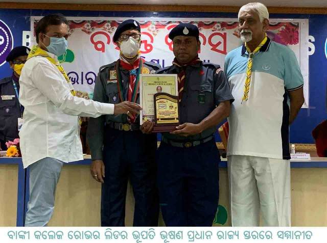 ଓଡ଼ିଶା ତାଜା ନ୍ୟୁଜ (୧୧ ସେପ୍ଟେମ୍ବର ଶନିବାର ) ବାଙ୍କୀ :- ବାଙ୍କୀ ସ୍ୱୟଂଶାସିତ ମହାବିଦ୍ୟାଳୟର ରୋଭର ଲିଡର ଭୂପତି ଭୂଷଣ ପ୍ରଧାନ ଭାରତ ସ୍କାଉଟ ଗାଇଡ୍ସ ଓଡ଼ିଶା ତରଫରୁ ସ୍ୱର୍ଗତ ବସନ୍ତ କୁମାର ବିଶ୍ୱାଳଙ୍କ ସମ୍ମାନରେ ସମ୍ମାନୀତ ହୋଇଛନ୍ତି । ଶ୍ରୀ ପ୍ରଧାନ ନିଜର ନିଷ୍ଠା ଓ ସମାଜ ସେବା ମନୋବୃତ୍ତି ବଳରେ ସେ ଲୋକପ୍ରିୟତା ହାସଲ କରିପାରିଛନ୍ତି ।