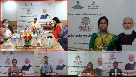 କେନ୍ଦ୍ରମନ୍ତ୍ରୀ ଶ୍ରୀ ପ୍ରଧାନ ଶୁକ୍ରବାର ପବିତ୍ର ବିଶ୍ୱକର୍ମା ଜୟନ୍ତୀ ଅବସରରେ ଭାରତବର୍ଷର ବିଭିନ୍ନ ରାଜ୍ୟରୁ ଦକ୍ଷ ପ୍ରଶିକ୍ଷକ ମାନଙ୍କୁ ଭର୍ଚ୍ଚୁଆଲ ପ୍ଲାଟଫର୍ମରେ ଉଦ୍ୟମିତା ପ୍ରଶିକ୍ଷକ ସମେତ ବିଭିନ୍ନ ବିଭାଗରେ ୩୬ ଜଣ ପ୍ରଶିକ୍ଷକଙ୍କୁ କୌଶଲାଚାର୍ଯ୍ୟ ପୁରସ୍କାର-୨୦୨୧ରେ ସମ୍ମାନିତ କରିଛନ୍ତି । ଓଡ଼ିଶାରୁ ଜନ ଶିକ୍ଷଣ ସଂସ୍ଥାନର ହସ୍ତକଳା ପ୍ରଶିକ୍ଷକ ଚନ୍ଦ୍ରାବଳୀ ଖଟୁଆ, ଜନ ଶିକ୍ଷଣ ସଂସ୍ଥାର ବୈଷୟିକ ପ୍ରଶିକ୍ଷକ ଅଜୟ କୁମାର ସ୍ୱାଇଁ, ଆଇଟିଆଇରେ ମାଷ୍ଟର ଟ୍ରେନର ବିପିନ ବିହାରୀ ଗୌଡ଼ ଏବଂ ଆଇଟିଆଇରେ ଡ଼ିଜିଟି ମାଷ୍ଟର ଟ୍ରେନର ନିବେଦିତା ମୋହନପାତ୍ରଙ୍କୁ କୌଶଲାଚାର୍ଯ୍ୟ ପୁରସ୍କାର ପ୍ରଦାନ କରାଯାଇଛି ।