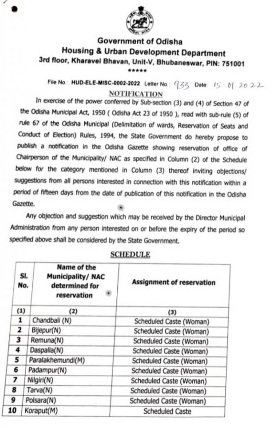 ସେହିପରି ପଦ୍ମପୁର ବିଜ୍ଞାପିତ ଅଞ୍ଚଳ ପରିଷଦ ଅନୁସୂଚିତ ଜାତି ମହିଳା ଏବଂ ନବ ଗଠିତ ବିଜେପୁର ବିଜ୍ଞାପିତ ଅଞ୍ଚଳ ପରିଷଦ ର ଅଧ୍ୟକ୍ଷ ପଦବୀ ଅନୁସୂଚିତ ଜାତି ମହିଳା ଙ୍କ ପାଇଁ ସଂରକ୍ଷିତ ରହିଛି । ବିଜେପୁର ବିଜ୍ଞାପିତ ଅଞ୍ଚଳ ପରିଷଦ ରେ ଚଳିତ ଥର ପ୍ରଥମ ଥର ପାଇଁ ନିର୍ବାଚନ ହେବ । ରାଜ୍ୟ ନଗର ଉନ୍ନୟନ ବିଭାଗ ପକ୍ଷରୁ ଚିଠି ନଂ ୯୩୩/୧୫.୧.୨୨ ନୁଯାଇ ବିଜ୍ଞପ୍ତି ଆଜି ପ୍ରକାଶିତ ହୋଇଛି ।